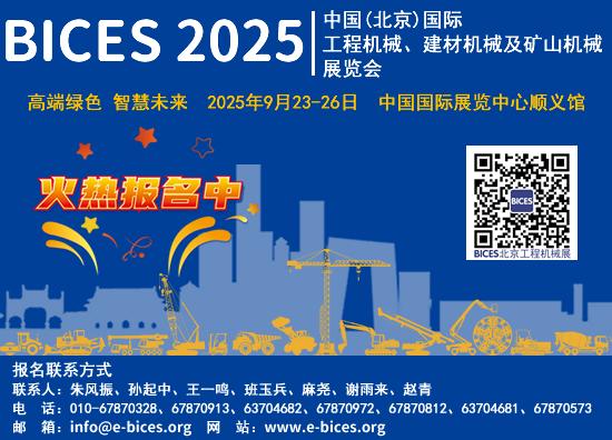 中國(北京)國際工程機械、建材機械及礦山機械展覽會(BICES 2025)將于9月23—26日在中國國際展覽中心順義館舉辦,本屆展會以“高端綠色,智慧未來”為主題,聚焦高端化、智能化、綠色化三大核心方向,全面展現(xiàn)中國乃至全球工程機械產業(yè)的創(chuàng)新活力。