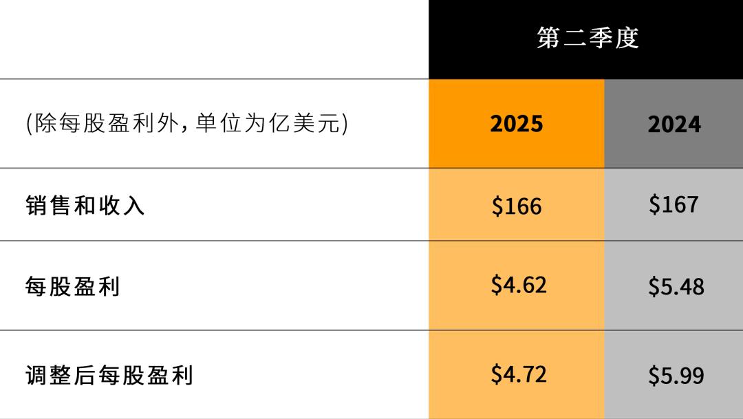 2025年第二季度營業利潤率為17.3%,而2024年第二季度為20.9%。2025年第二季度調整后營業利潤率為17.6%,而2024年第二季度為22.4%。2025年第二季度每股盈利為4.62美元,而2024年第二季度每股盈利為5.48美元。2025年第二季度調整后每股盈利為4.72美元,而2024年第二季度調整后每股盈利為5.99美元。2025年第二季度和2024年第二季度,調整后營業利潤率和調整后每股盈利均不包括重組成本。